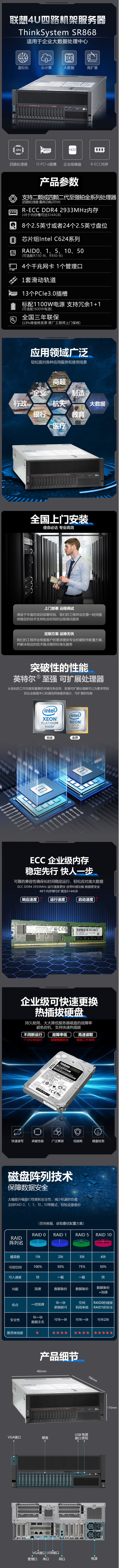 联想(Lenovo)SR868/SR860机架式服务器4U双路 GPU主机 OA应用深度学习2颗6418H 48核2.1G 128G内存丨8块1.2T企业级硬盘