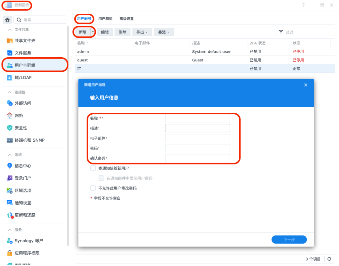 第一步自然是为每一位员工创建一个专属帐号,您可以使用管理员帐号在如下位置创建。之后再创建一下群组,并将所属员工加入群组中。群组晖姑娘强烈建议大家设置一下!因为一旦有新员工入职或人员变更,只需将其加入群组或变更群组即可,无需重复设置。接下来就需要建立共享文件夹了,这个是最基础的文件夹单位,需要在【控制面板】的下图位置创建。注意!记得勾选【对没有权限的用户隐藏子文件夹和文件】,其他选项如无特殊要求,保持默认即可。最后还要前往下图位置,勾选一下【对没有权限的用户隐藏共享文件夹】。4.权限规则